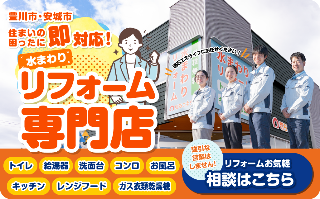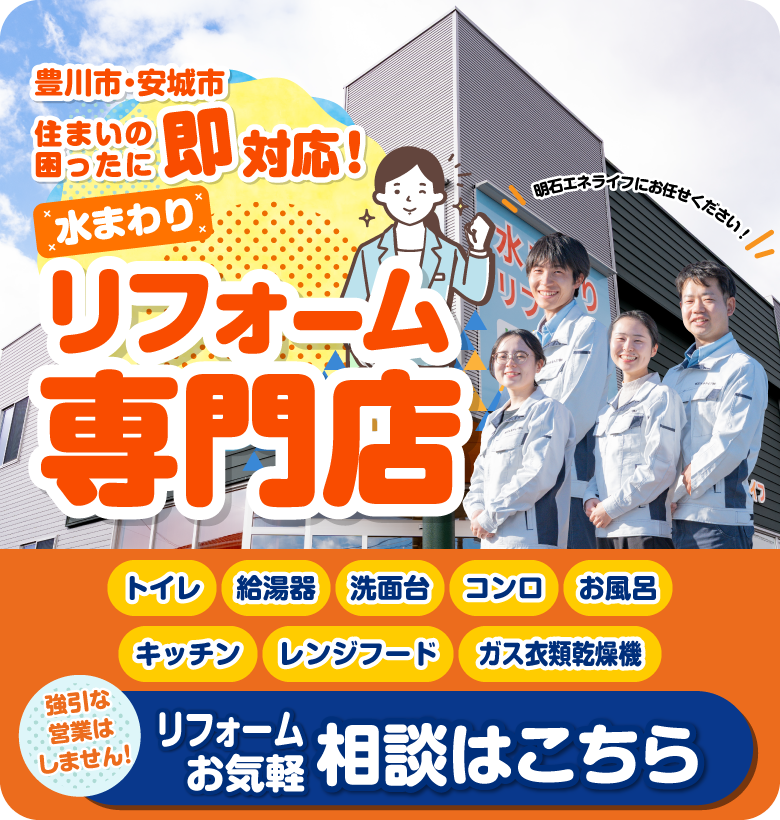 明石エネライフは愛知県豊川市・安城市のリフォーム専門店。水まわりリフォーム専門店だから気軽にリフォームが可能です。